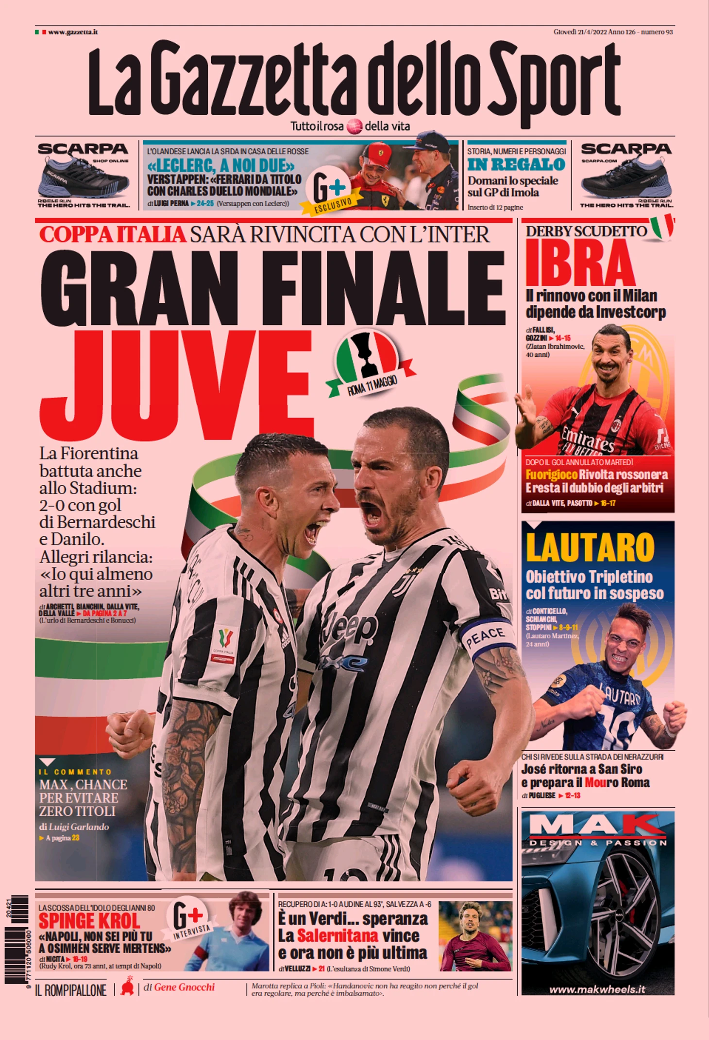 Gazzetta: «Большой финал «Юве»: «Кубок Италии, будет месть с «Интером». «Фиорентина» побеждена также на «Стэдиуме»: 2:0 с голами Бернардески и Данило. Аллегри перезагружает: «Я здесь по меньшей мере на три года».