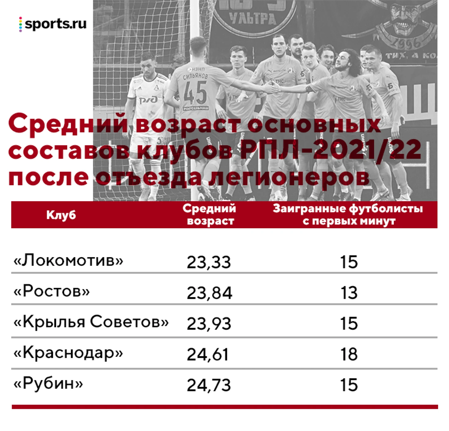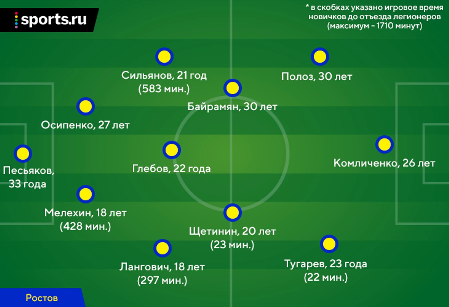 После отъезда легионеров стартовый состав «Ростова» – второй по молодости в РПЛ. В резерве Карпина есть несколько опытных (Денис Терентьев, Игорь Калинин, Александр Селява, Али Соу), но большинство игроков в запасе – молодежь. Например, на замены выходят Николай Поярков, Егор Голенков (обоим по 22 года) и Данила Сухомлинов (19 лет).