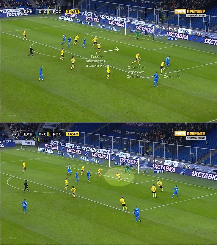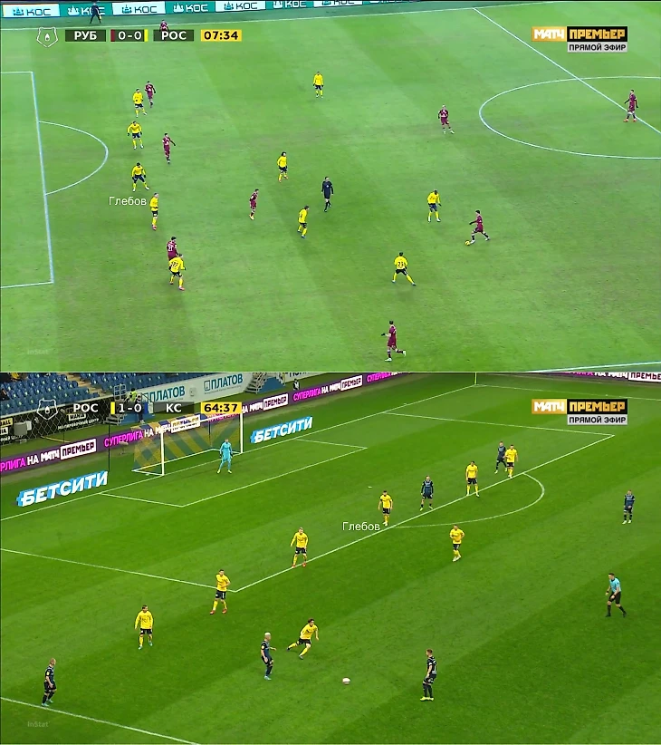 Следствие эпизодов – регулярные перехваты и выносы из штрафной плюс работающая подстраховка между защитниками. В этом эпизоде Глебов сел третьим центральным, что могло помочь Сильянову, который пустил соперника за спину: Осипенко выдвинулся на Захаряна, но не сумел помешать прострелить – передачу прервал именно Глебов.