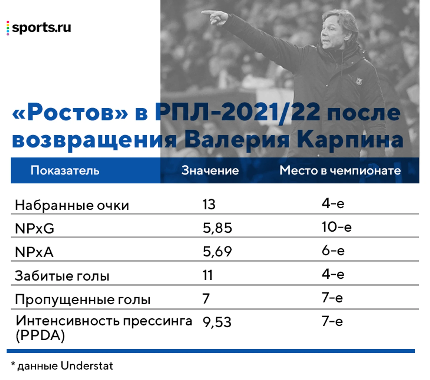 После назначения Валерия Карпина «Ростов» набрал 13 очков (4-е место весной). Валерий Карпин не отказывается от своего стиля: использует прессинг, узкие 4-3-3, тройка нападения часто заполняет штрафную и убегает за спину.