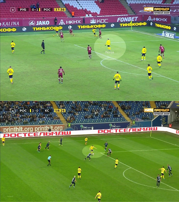 Полоз помогал взламывать соперника из флангов/полуфлангов. Ниже эпизоды, когда «Ростов» владел мячом после аута, а Дмитрий искал свободное пространство, чтобы перевести игру в штрафную.