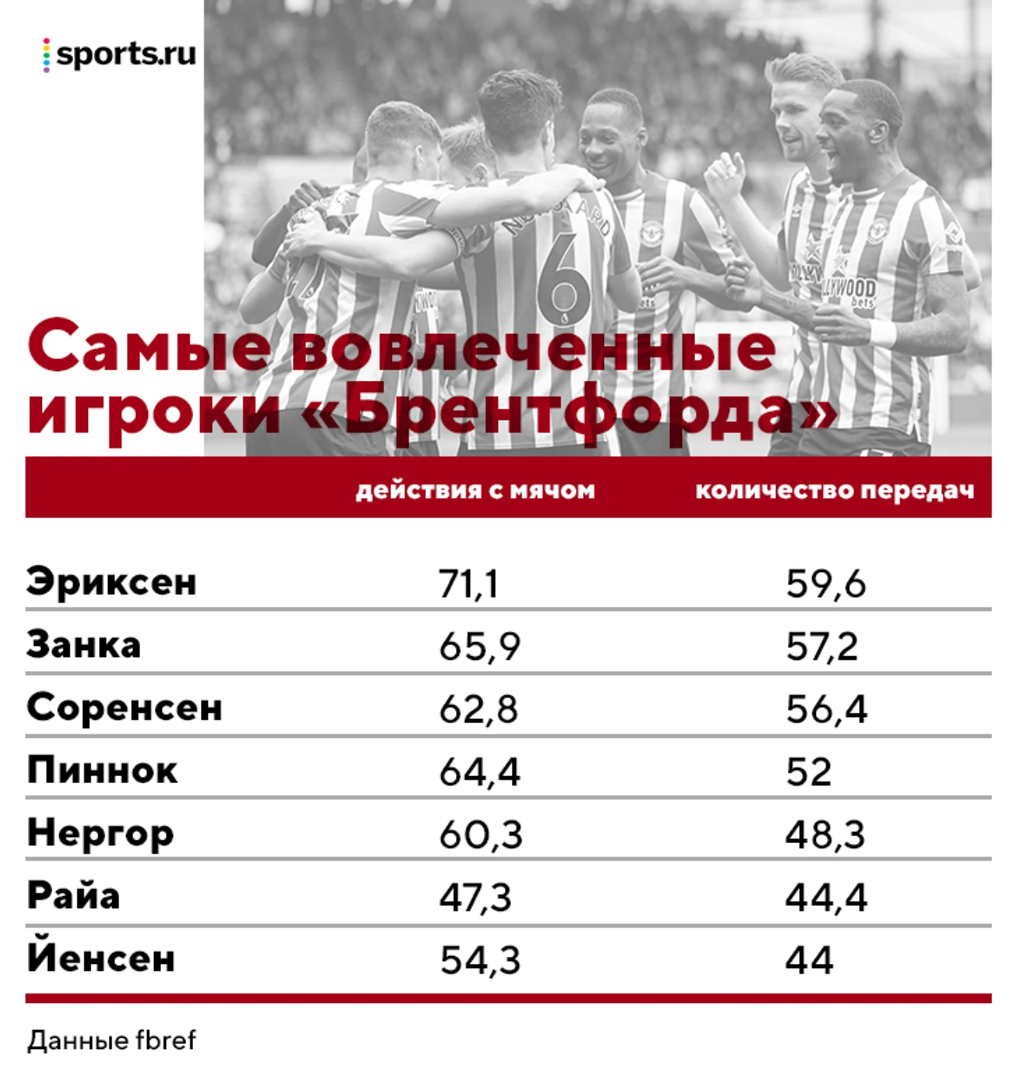 Датчанин сразу стал центром притяжения мяча и сделал «Брентфорд» более гибким, разнообразным и опасным. «Вы всегда можете отдать мяч Эриксену, и он найдет решение», – сказал Франк после уверенной победы над «Челси» на «Стэмфорд Бридж». Эриксен уже лидер команды по действиям с мячом и количеству передач.