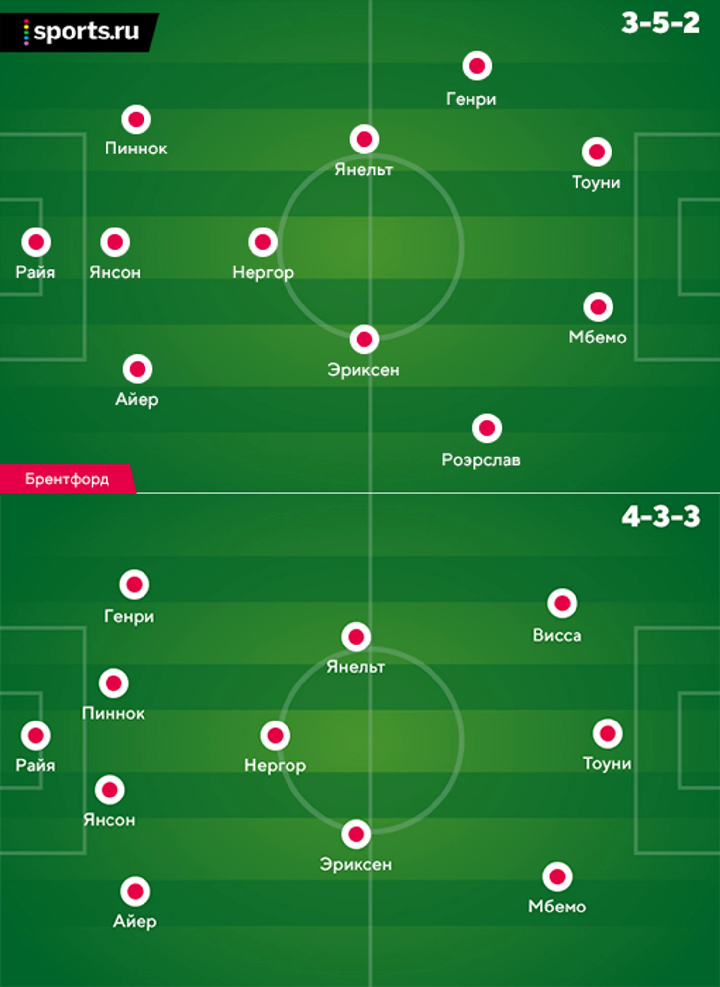 На старте сезона «Брентфорд» удивил качеством игры для новичка АПЛ и запомнился мощными матчами против топ-команд: устроили яркую перестрелку с «Ливерпулем», где не уступили ни по счету (3:3), ни по качеству моментов, ни по качеству игры. Проиграли «Челси», но устроили мощнейший штурм в конце: 15-0 по ударам в последние 20 минут, «Челси» вытащили Менди, Чалоба и каркас ворот (дважды). Потом был спад, связанный с травмами ключевых игроков. В последних 6 матчах у «Брентфорда» 5 побед. Это не случайность. Франк как раз попробовал новую схему, в состав вернулись Давид Райя, Айван Тоуни – и в старте начал играть Кристиан Эриксен.