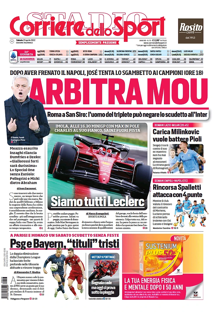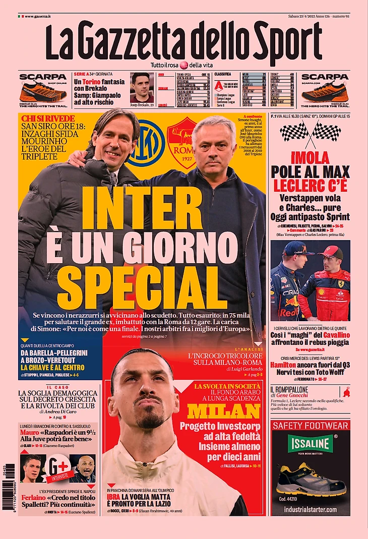 «Интер», Особенный день»: «Кого мы видим: «Сан Сиро», 18:00 (СЕТ): Индзаги сразится с Моуриньо, героем Триплеты. Если выиграют, Нерадзурри приблизятся к Скудетто. Все билеты проданы: 75 тысяч также для того, чтобы поприветствовать великого бывшего тренера, непобедимого с «Ромой» в 12 играх. Заряд от Симоне: «Для нас это как финал. Наши арбитры среди лучших в Европе».
