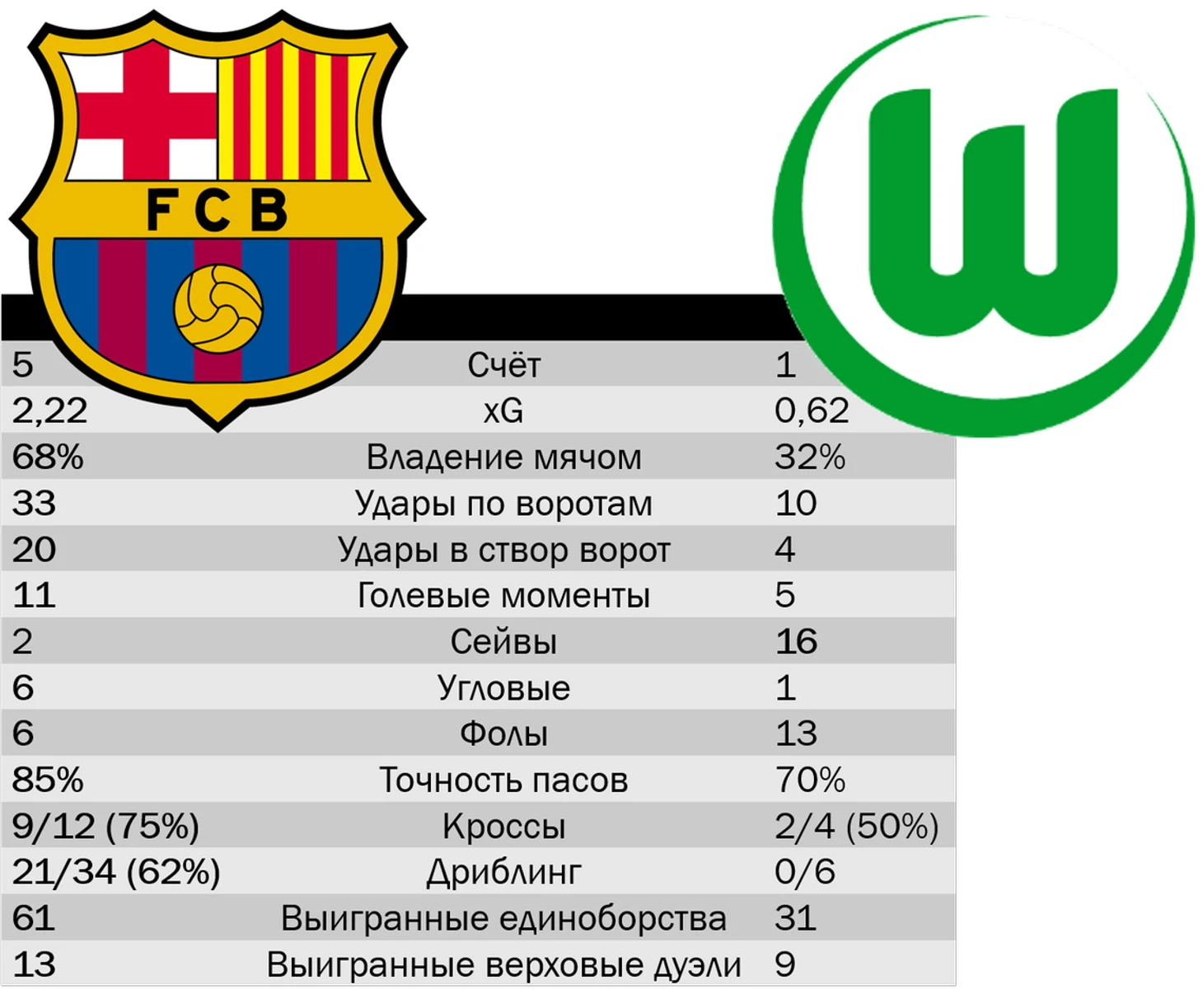 Отдельно хотелось бы отметить интересный статистический момент. Игра «Барсы» и «Вольфсбурга» – это встреча двух команд, которые очень любят забивать ранние голы (88% против 70%), при том, «зелёно-белые» даже более успешно проводят первые таймы (2,4 очка), чем «сине-гранатовые» (2,13 очка). Но не в этот раз.