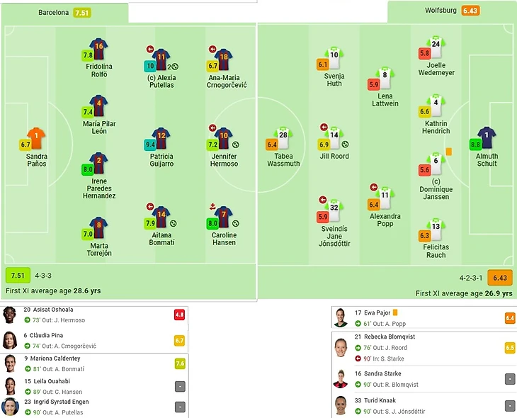 Ориентируясь сугубо на визуальные ощущения, после игры хочется похвалить Грэм Хансен и Рольфё. Фланги у «Барселоны» были быстры и опасны. В общем-то, как это обычно и бывает. Каролин так вообще большая умница – который еврокубковый матч подряд она отмечается результативными действиями и красивым дриблингом. Как она убрала соперницу в ситуации со вторым голов – просто красота. Ну а королевой вечера стала Алексия Путельяс. В коем-то веке, SofaScore согласен с УЕФА.