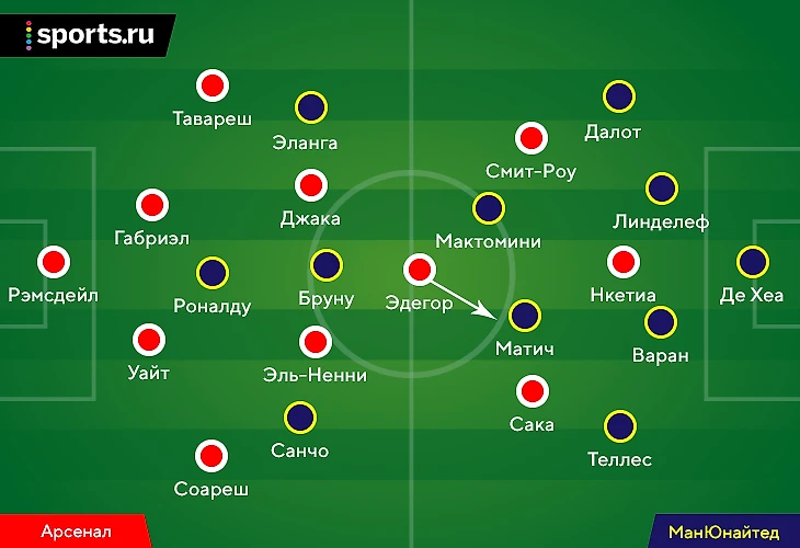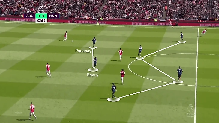 Задачей Роналду и Бруну был прессинг центральных защитников «Арсенала», Эланга и Санчо действовали по крайним. А вот Мактомини и Матичу досталась более трудная ноша.