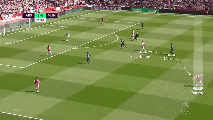 Во-первых, они изначально оказывались в меньшинстве – против них была троица из Джаки, Эль-Ненни и Эдегора. Во-вторых, сложностей добавляло фирменное движение Эдегора – норвежца всегда тянет к правому флангу. Из-за этого опорники «МЮ» были вынуждены и разрываться между игроками, и покрывать большое пространство (не только центр прикрывать, но и один из флангов):
