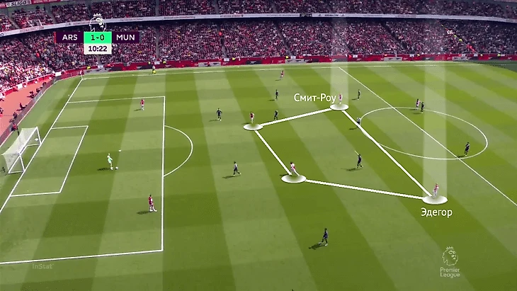 Эпизодически «Арсенал» переходил к еще более интересной структуре. К троице из Джаки, Эль-Ненни и Эдегору добавлялся Эмиль Смит-Роу – для этого смещался с левого фланга в центр. В итоге у хозяев образовывался квадрат в центре поля: