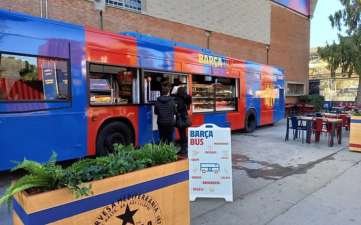 Фудтрак (по факту, целый автобус!), который идеально подходит для того, чтобы насладиться различными сладостями, начиная от фирменного «сине-гранатового» мороженого и молочных коктейлей, заканчивая блинчиками, вафлями (с топпингами Barça), и чуррос с шоколадом (что-то вроде нашего хвороста, но из заварного теста).