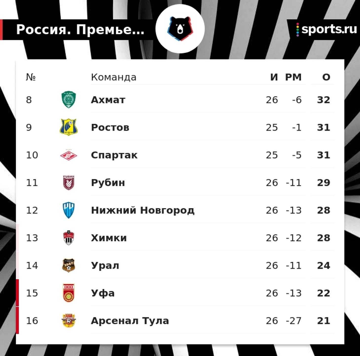 «Арсенал» и «Уфа» – очевидные кандидаты на вылет, не так далеко «Урал». Остальные – «Химки», «Нижний Новгород», «Рубин» – оторвались, но кто-то из них точно попадет в стыки. А ведь «Спартак», «Ростов» и «Ахмат» тоже не в полной безопасности.