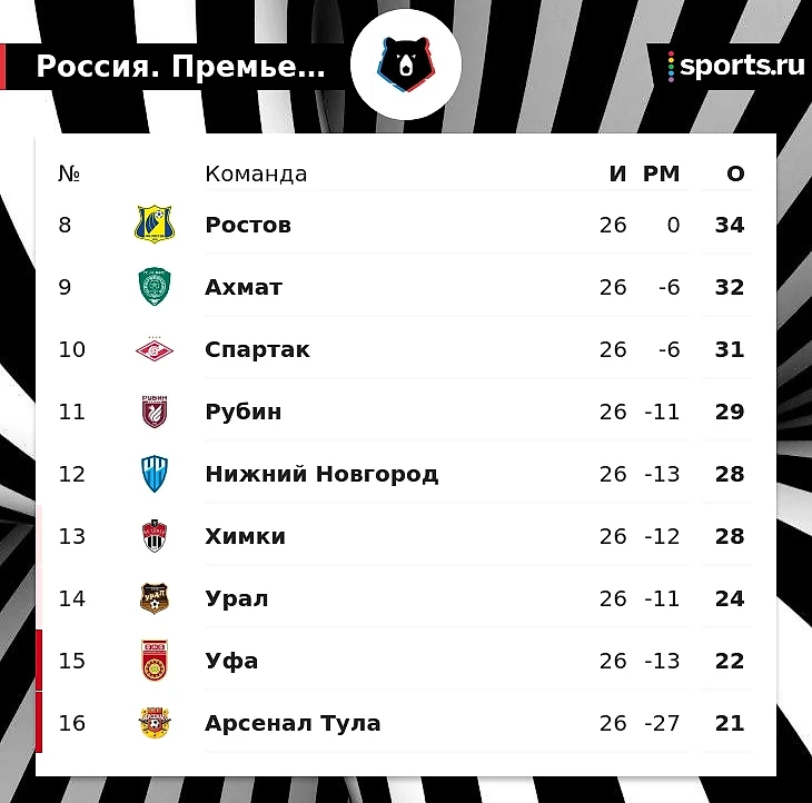 • «Арсенал» и «Уфа» – очевидные кандидаты на вылет, не так далеко «Урал». Остальные – «Химки», «Нижний Новгород», «Рубин» – оторвались, но кто-то из них точно попадет в стыки.