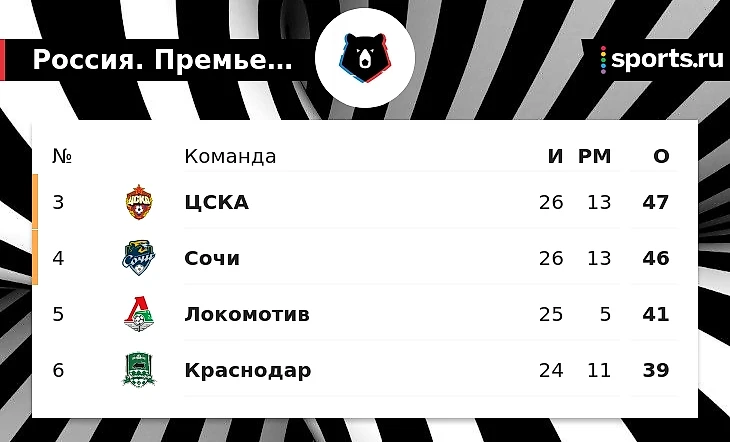 На третье место претендуют четыре команды – ЦСКА, «Сочи», «Локомотив» и «Краснодар». ЦСКА сохраняет третью строчку, но «Сочи» отстает всего на одно очко. Сложнее будет «Локо», который проигрывает армейцам сразу шесть баллов. У «Краснодара» на два очка меньше, чем у «Локомотива», при этом две игры в запасе.
