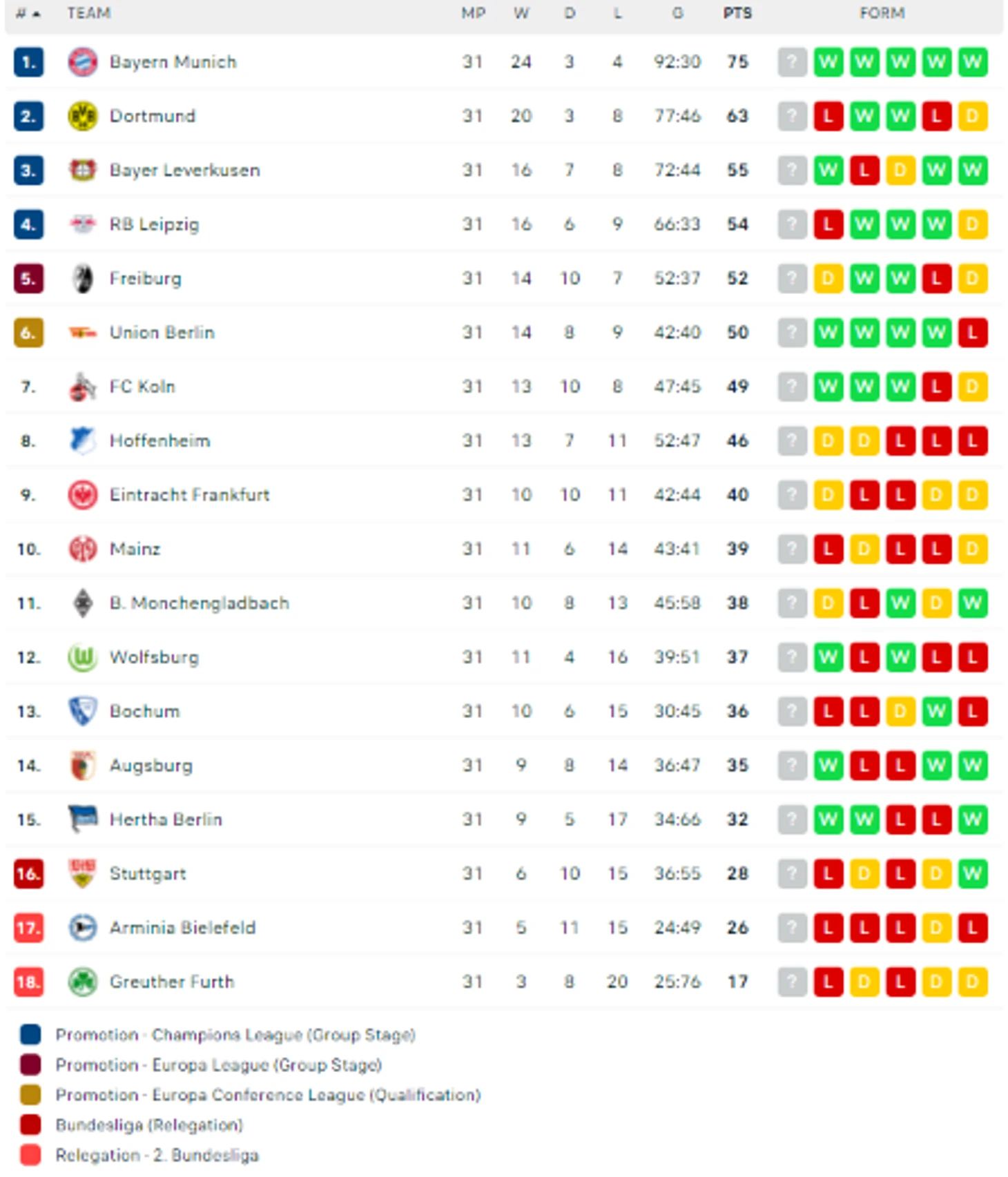 Позади 31 тур Бундеслиги. В прошлом туре «Бавария» выигрывает десятое чемпионство подряд. Впереди еще 3 тура, потенциальных 9 набранных очков и 6 команд, которые пока еще в гонке за выживание.