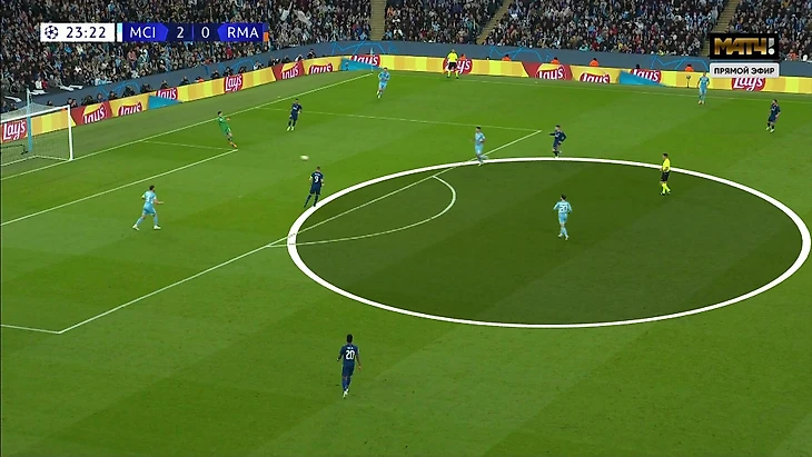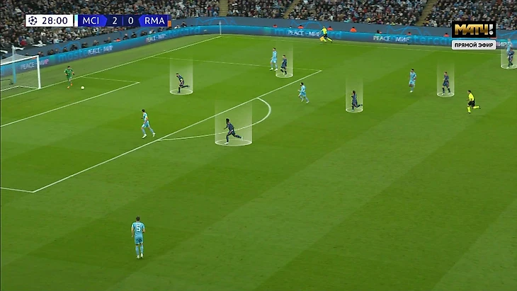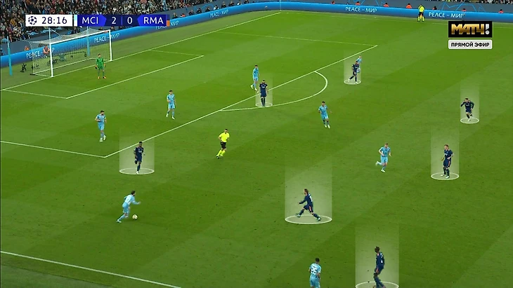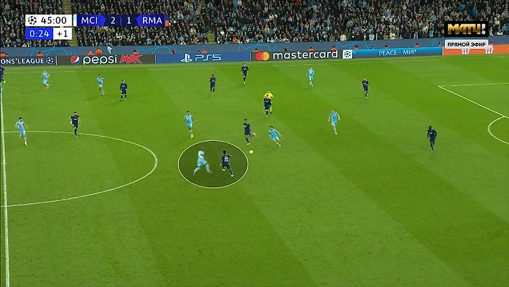 Второй тайм: чуть более спокойная игра относительно первой половины. «Реал» не раскрывался так явно в прессинге, а «Сити» получше удерживал мяч. Вероятно, это связано с тем, что отставание составляло всего один гол (если это менялось, «Реал» быстро возвращал счет – рисунок не успевал сильно измениться). Шоу второго тайма – в большей степени про реализацию, а не про безумие в прессинге (как в первом).