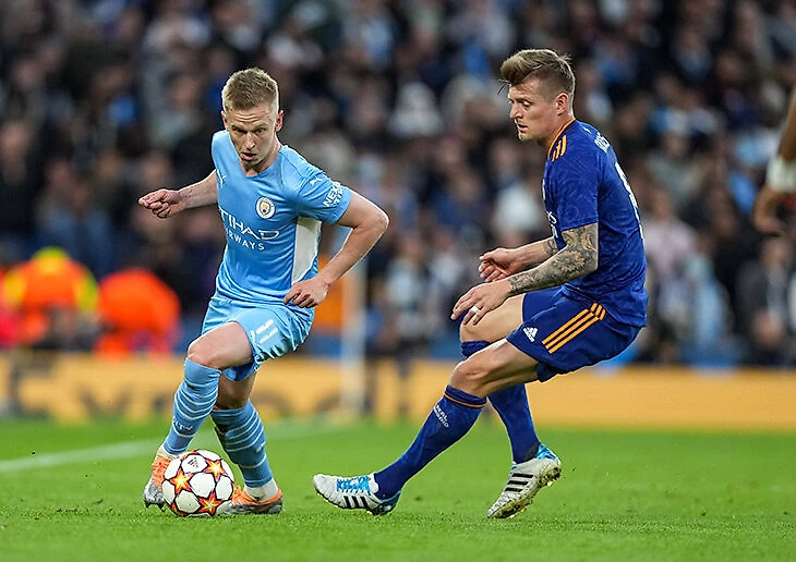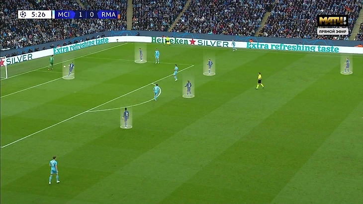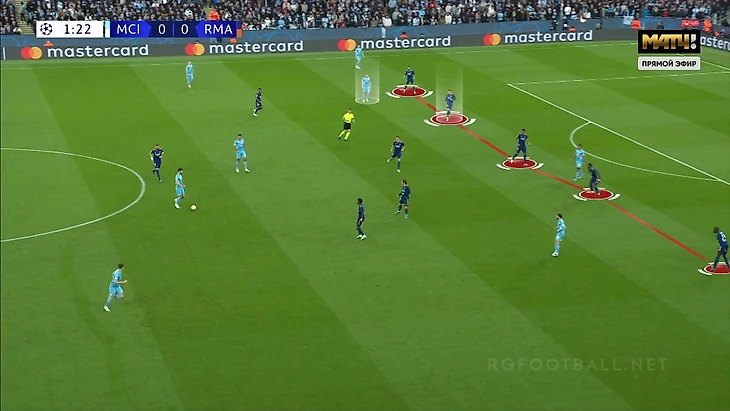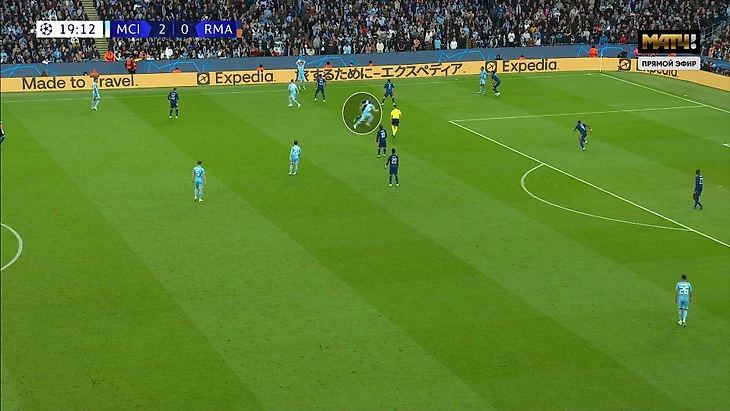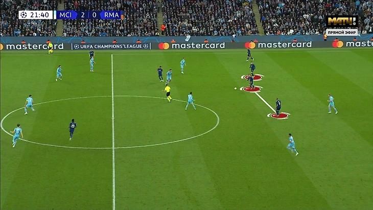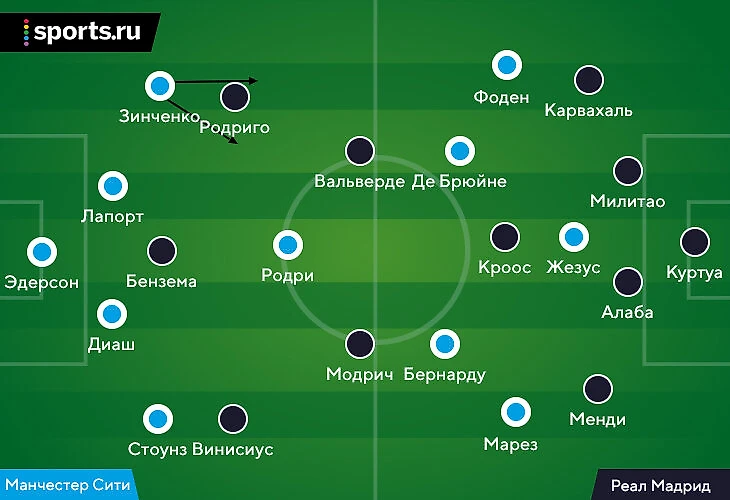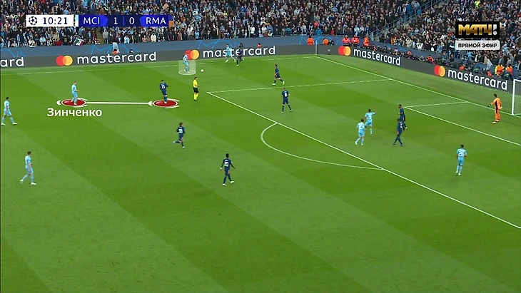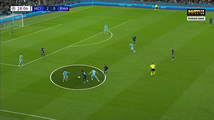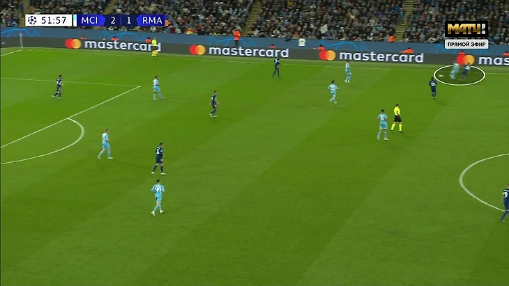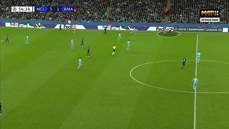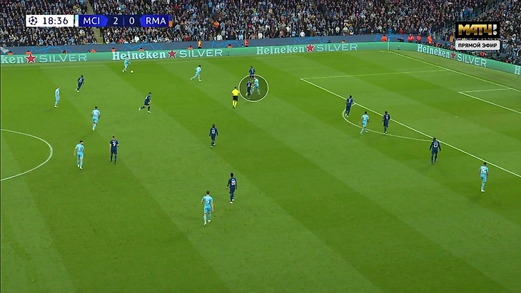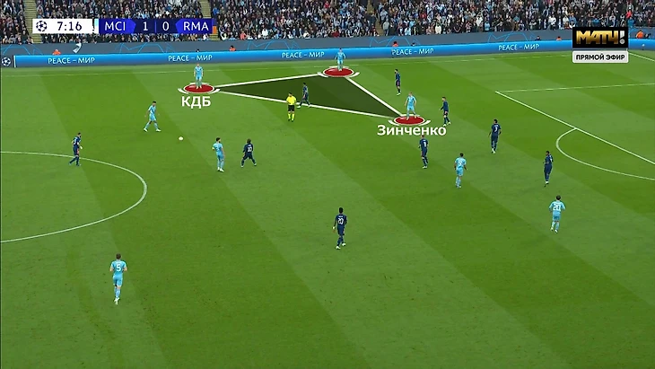 «Сити» либо получал свободного КДБ на фланге (он опасен даже оттуда), либо свободного Зинченко в полуфланге (это слишком опасная зона). «Реал» терялся в попытках реагировать на это движение. Например, в голевом эпизоде после смены позиции Вальверде доигрывал по Зинченко, а КДБ исполнил шикарный пас в штрафную из фланговой зоны.