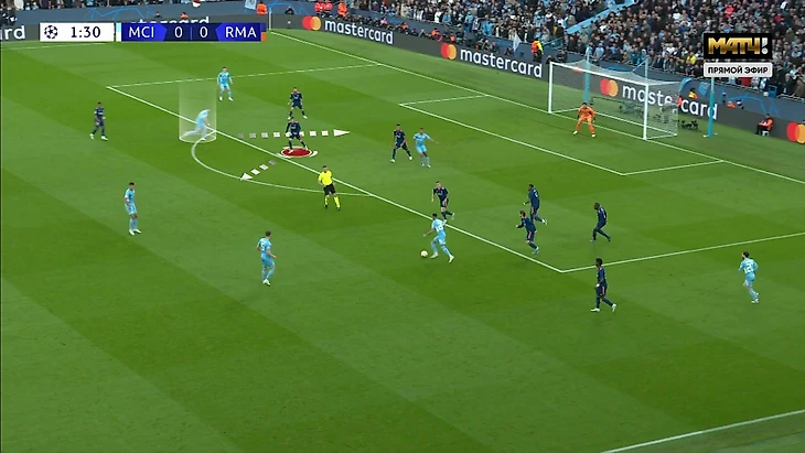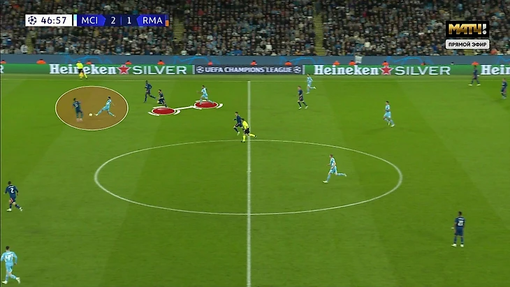 8. Очень похоже, что «Реал» не собирался так смело прессинговать, но пошел ва-банк из-за быстрых пропущенных мячей. Прессинг «Мадрида» был агрессивным, интенсивным и задействовал большое количество игроков, но результат мог быть абсолютно любым. Например, перехват на чужой трети и потенциальная угроза ворота Эдерсона: