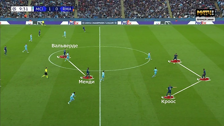 Тут Кроос опускается к центральным защитникам, но не в рамках структуры, а при крайне хаотичном расположении – все игроки близко друг к другу (так их проще накрывать). Опорную зону составляют Менди и Вальверде (даже если получат мяч, не очень хороши под давлением); Модрич, который мастерски разбивает давление, вне кадра: