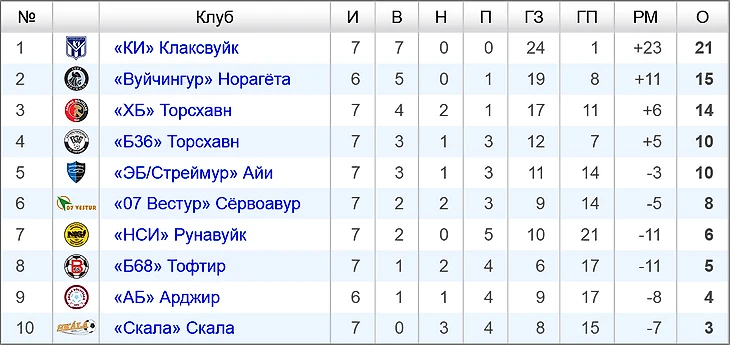 «07 Вестур» Сёрвоавур – «НСИ» Рунавуйк – 3:2 (1:0) Голы: Борхерс (45, 52, 54) – Давидсен (70), Ольсен (87)