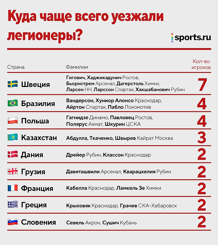 Похожая ситуация с чемпионатом Бразилии, туда перед началом сезона возвращаются футболисты, которые там уже играли: бразильцы Айртон, Пабло, Вандерсон и парагваец Хуниор Алонсо (перешел в «Краснодар» из бразильского «Атлетико-Минейро», так и не сыграл ни одного официального матча в России).