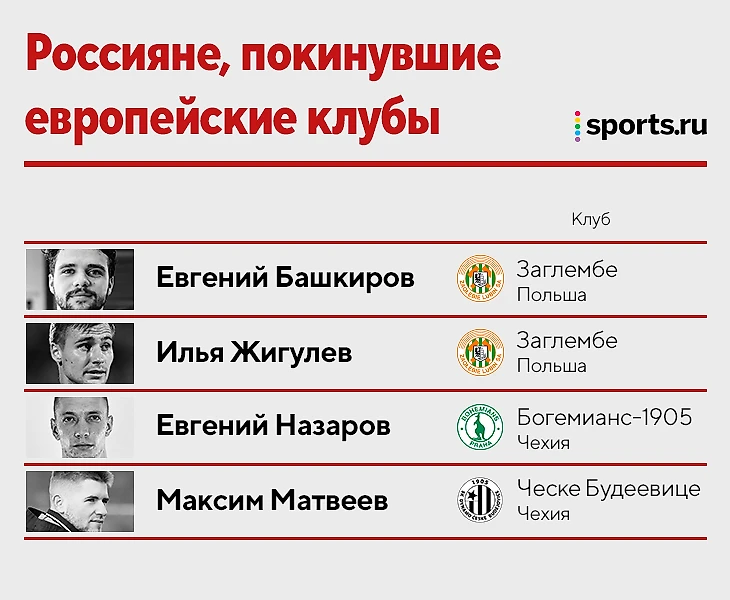 Так получилось у Ильи Жигулева и Евгения Башкирова из польского «Заглембе». Башкиров из-за травмы не играл с сентября, а 13 апреля расторг контракт по соглашению сторон. Жигулев выходил на поля до 18 февраля, потом оказался вне заявки, и 20 апреля с ним расторгли контракт.