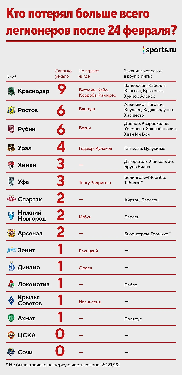 Больше всех от вынужденной миграции легионеров пострадал «Краснодар», потерявший сразу девять легионеров. Пятеро уехали в другие лиги, четверо – просто приостановили контракты до лета.