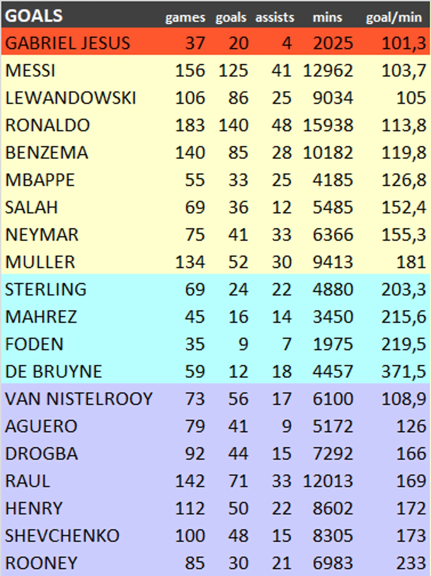 По средней результативности гол/сыгранные минуты он находитмся на ПЕРВОМ месте. Выше Месси, Роналду и всех остальных действующих и завершивших карьеру.