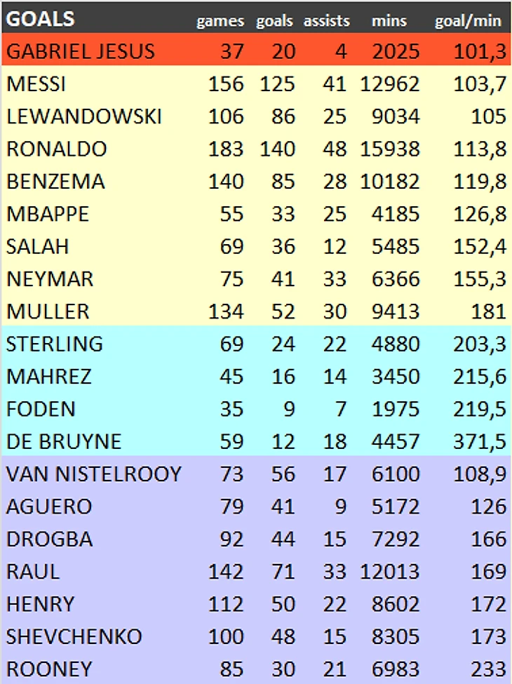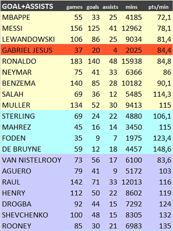 И учтем, что Жезус - единственный из игроков в списке, кто не имеет постоянного места в основном составе, и один из немногоих, кто не является штатным исполнителем пенальти и штрафных.