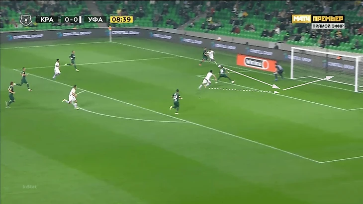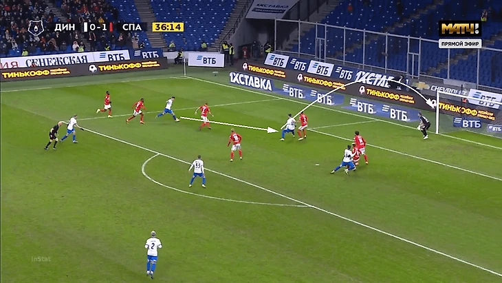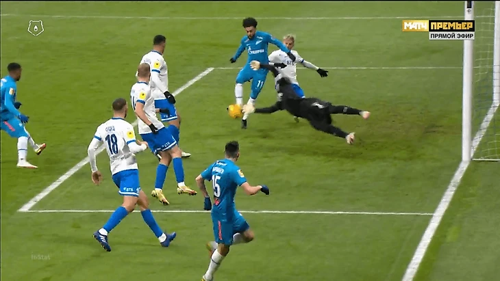 У Дзюбы – два (оба в цель), у Кассьерры – три, один не реализован. Вероятность гола в этом моменте, по модели Understat, 77%. Но все равно момент непростой – Гильерме после отскока сократил дистанцию, Баринов тоже мешал наносить удар.