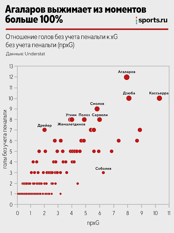 Итог: за сезон Агаларову выпало 10 шансов с вероятностью гола выше 30%, он реализовал – 8. Средний xG момента, который приводил к голу, – 0,4. Никто в РПЛ так бережно не относится к моментам. Для сравнения: у Кассьерры 6 реализованных шансов выше 30% из 13, у Дзюбы – 7 из 11 (максимально близок к Агаларову).