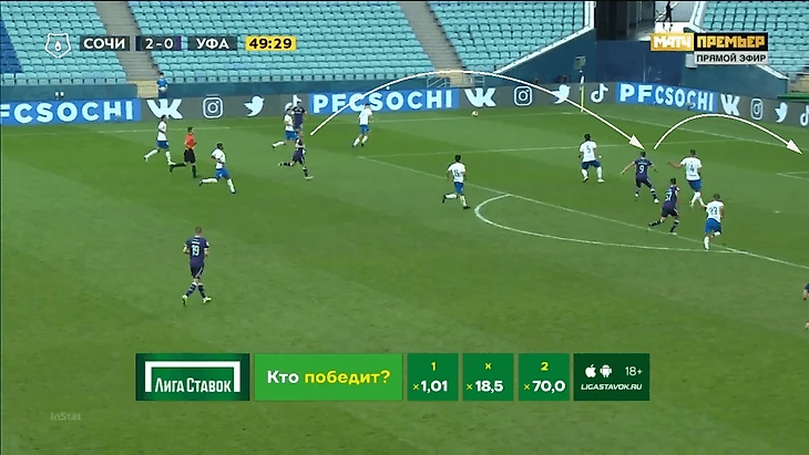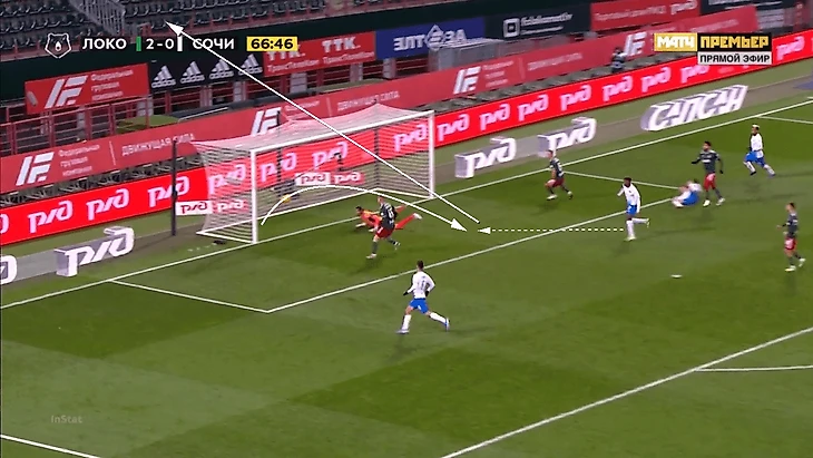Агаларов лидирует по количеству моментов с околонулевой перспективой (вероятность забить 0-5%) – 34 удара, из которых он выжал один гол в ворота «Сочи». Кстати, вот как выглядит такой момент. За спиной Агаларова был защитник, расстояние для удара головой с места не самое комфортное, но «Сочи» все равно пропустил. Но 33 удара не привели к взятию ворот.