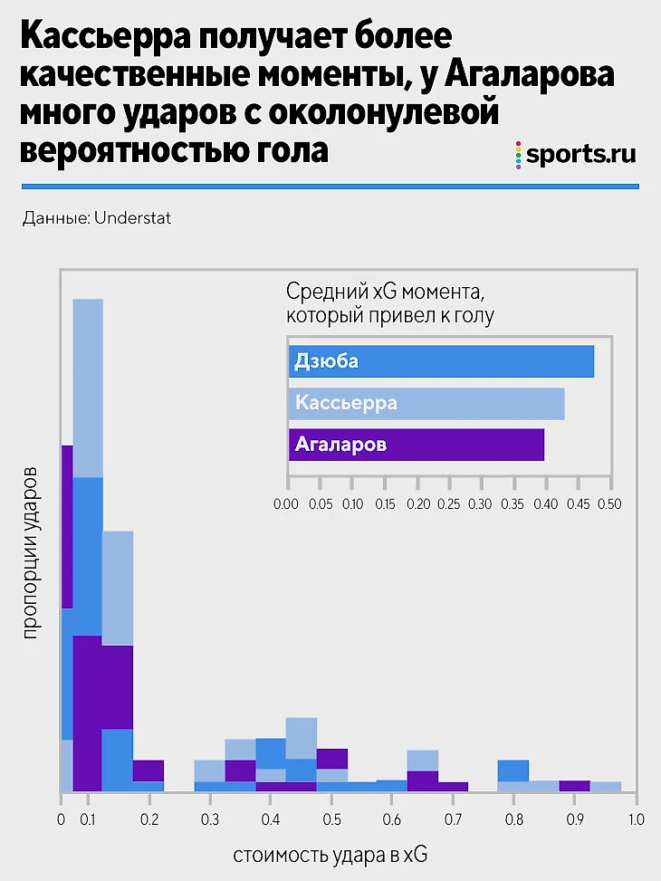 Крепких моментов (вероятность гола от 30 до 50%) у Агаларова заметно меньше, чем у Дзюбы и Кассьерры – 6, у форвардов «Сочи» и «Зенита» – по 10. Но! Из этих 6 моментов Агаларов извлек 4 гола! У Дзюбы тоже топовый процент реализации – 4 гола, у Кассьерры самый низкий из тройки – 3 гола.