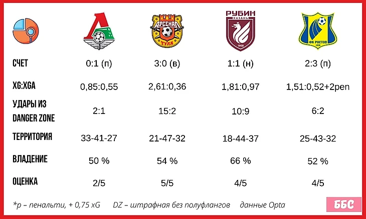 Неудачные матчи похожи друг на друга в плане сюжета. Дерби с «Локо» с минимумом опасных ситуаций напоминает домашнюю игру с ЦСКА в феврале – соперник не был лучше, но забил после дальних ударов. 2:3 в Ростове – флэшбек поединка против «Краснодара»: тоже безумное судейство с незасчитанными (VAR) и пропущенными со стандартов голами. Противостояние с «Рубином» с преимуществом красно-белых, но моментами в обе стороны, – аналог игры в Нижнем Новгороде.