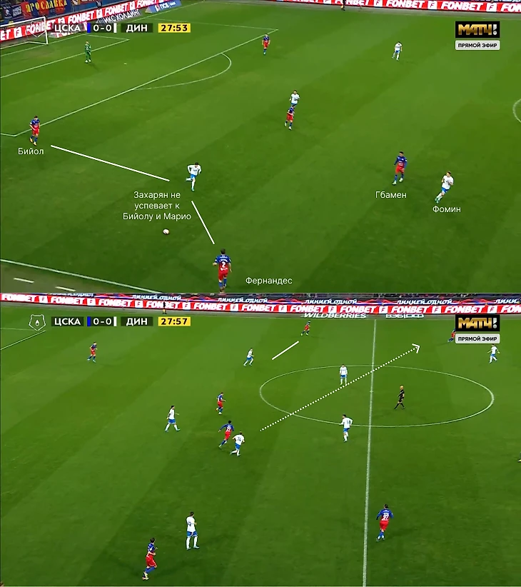 Еще один голевой момент – иллюстрация задумки Березуцкого. Фомин разрывался между Гбаменом и Марио (обычно в таких случаях восьмерка прессингует крайнего защитника) – так Фернандес получил мяч без давления, игроки ЦСКА отыграли Даниила и перевели мяч налево, где в изоляции был Карраскаль.