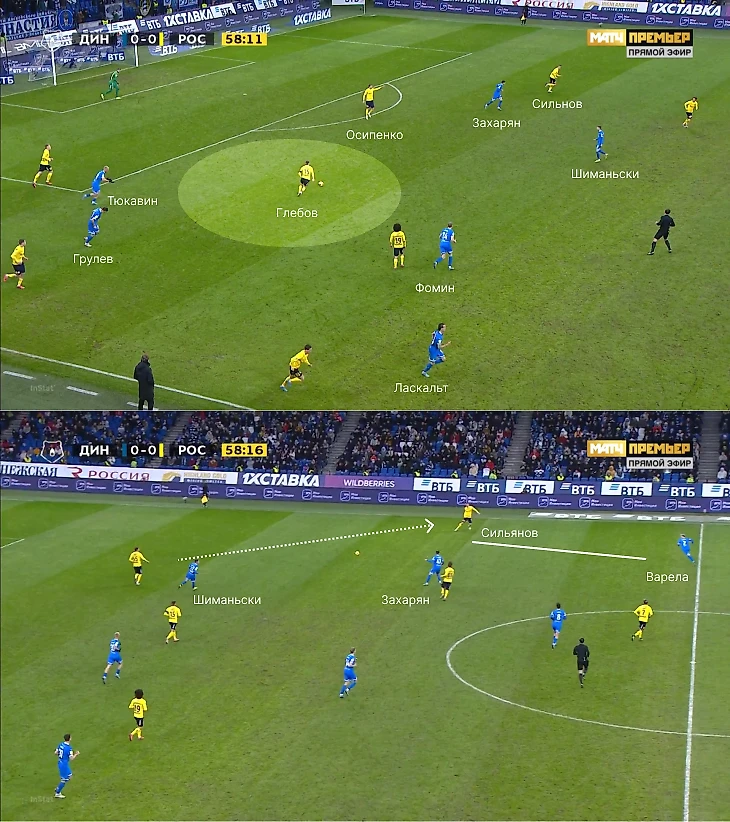 «Ростов» забил в результате цепочки ошибок (1:1): неравномерное давление, Шиманьски не вовремя бросился в прессинг, итог – Сильянов легко рванул в свободную зону.