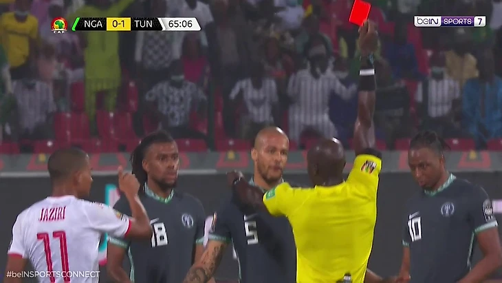 Удаление случилось в крайнем матче за сборную в 1\16 КАН-2021 против Туниса. Вышел на замену на 59 минуте и был удален через 7 минут!?