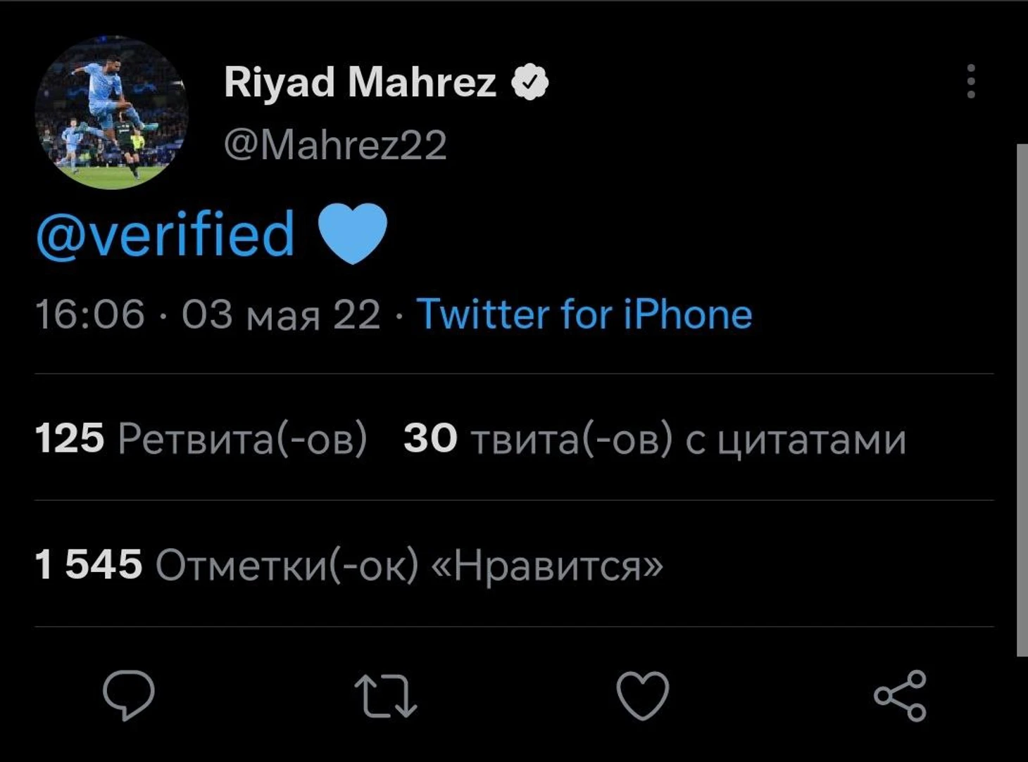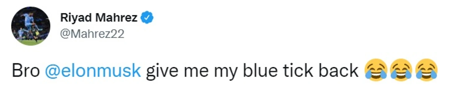 Вингер «Манчестер Сити» Рияд Марез призвал Илона Маска восстановить его синюю галочку в твиттере после ее загадочного исчезновения.
