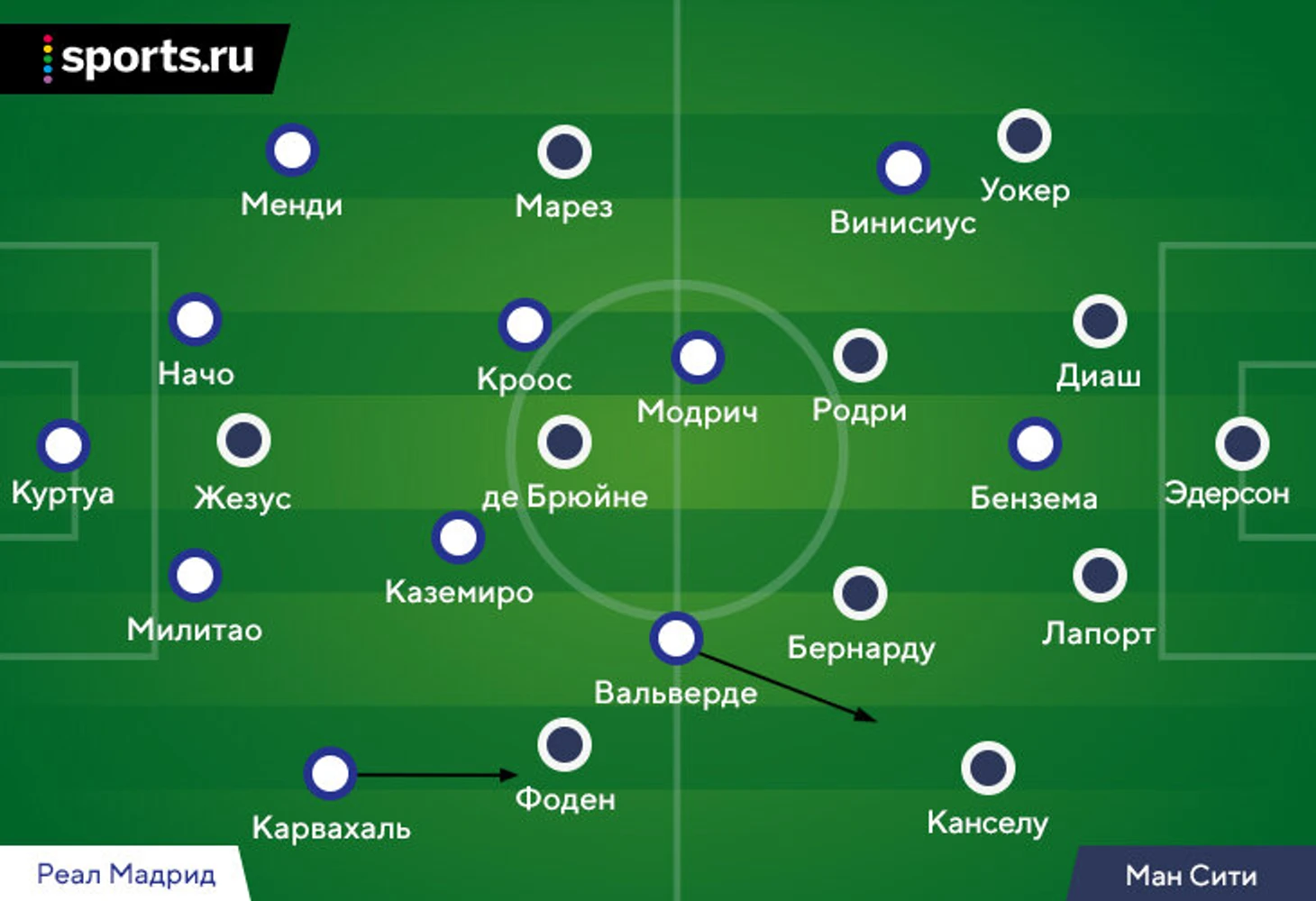 2. У «Сити» тоже было важное возвращение – Кайл Уокер на правый фланг защиты. Первый матч пропускали и он, и Жоау Канселу. Справа в защите (против Винисиуса) успели сыграть Джон Стоунз и Фернандиньо. В этот раз Гвардиоле были доступны все ключевые игроки – единственным отсутствующим был как раз Стоунз, который все равно не вышел бы в старте.