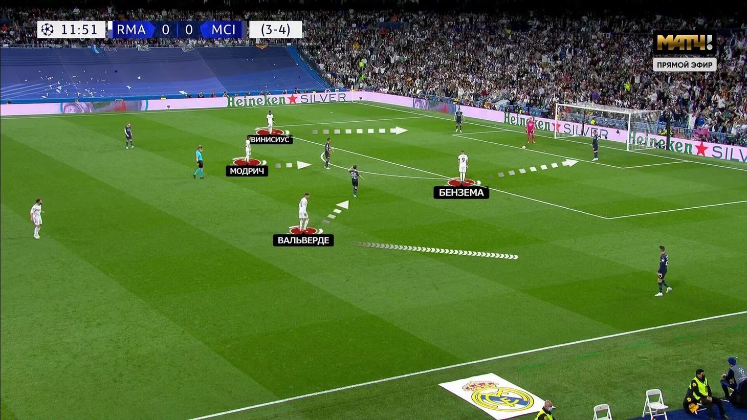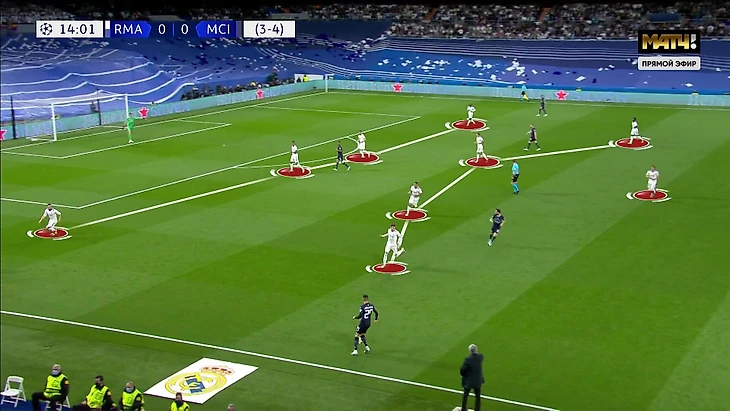 При прессинге «Мадрид» максимально насыщал центральную зону. Винисиус и Бензема давили на центральных защитников, а Вальверде и Модрич организовывали вторую волну (тоже с явным акцентом на центр):