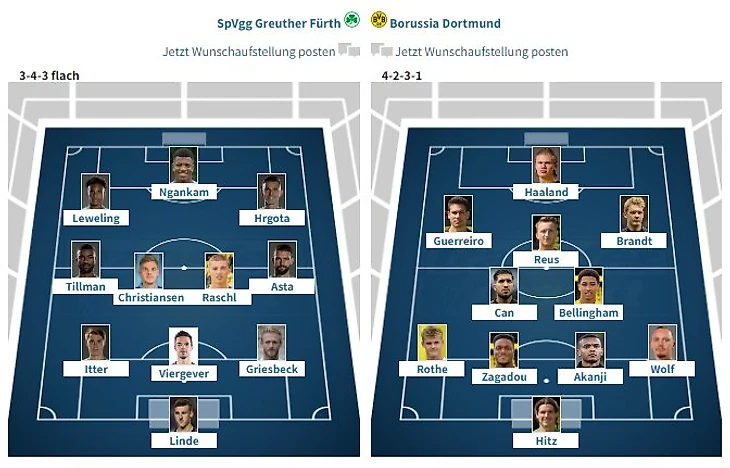 Dortmund: Hitz - Can, Akanji, Zagadou, Guerreiro - Witsel, Bellingham - Wolf, Reus (c), Brandt - Moukoko