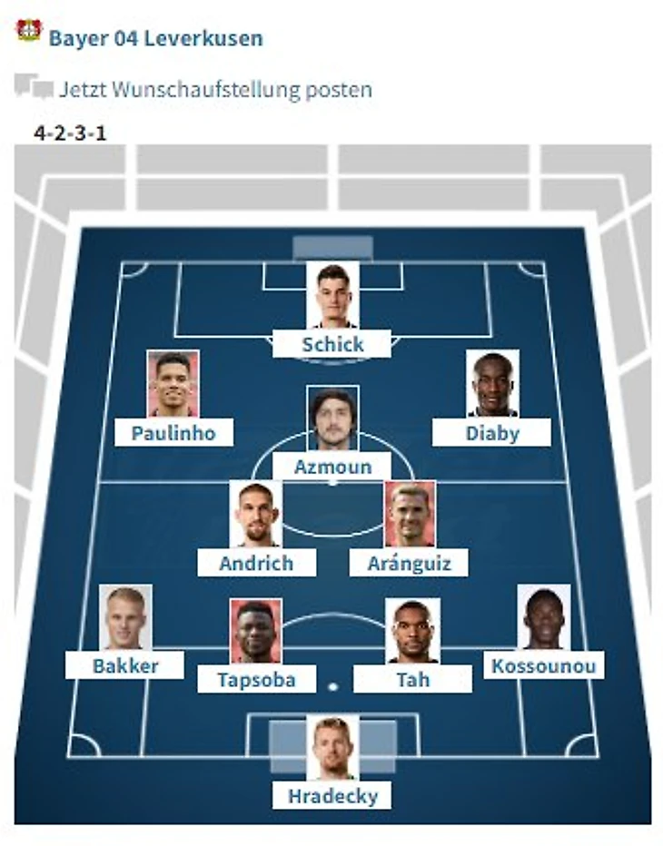 Leverkusen: Hradecky (c) - Kossounou, Tah, Tapsoba, Hincapie - Diaby, Andrich, Aranguiz, Paulinho - Azmoun, Schick