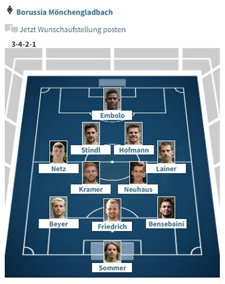 Gladbach: Sommer - Beyer, Ginter, Bensebaini - Lainer, Kramer, Neuhaus, Netz - Hofmann, Stindl (c) - Embolo