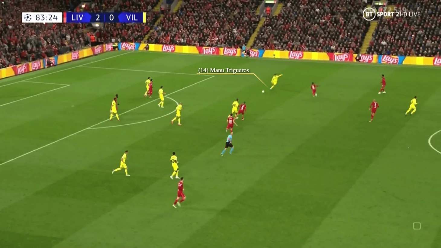 ....Хуан Фойт играет на своего игрока, а Ману Тригейрос, почти не глядя, совершает высокий и длинный пас поверх обороны «Ливерпуля».