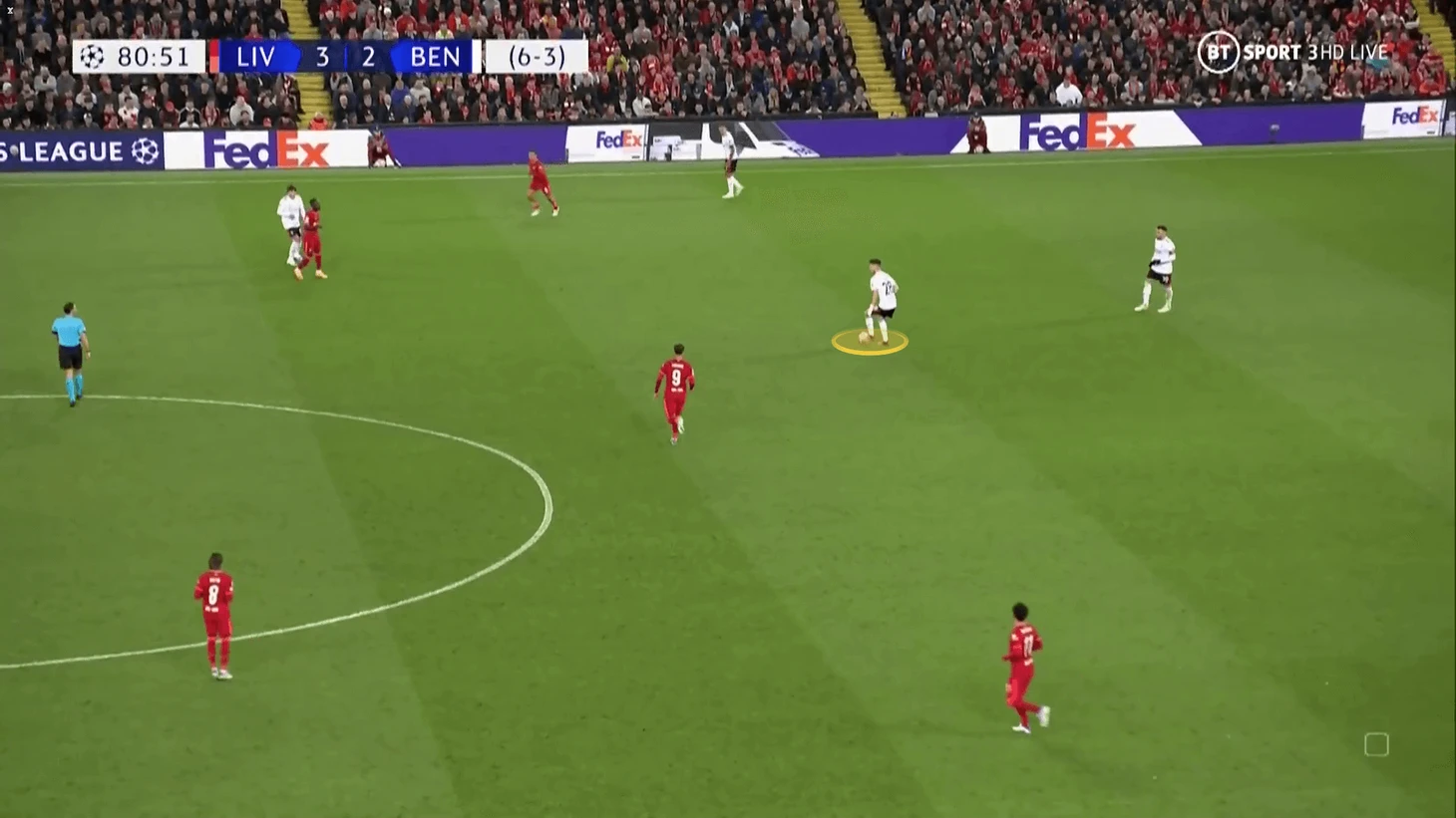 Помимо этого – и это то, что Клопп в прошлом называл источником проблем, когда обнажалась высокая линия «Ливерпуля» — «Бенфика» могла совершать передачи их центра своей половины поля с небольшим давлением на мяч. «Дело не в последней линии, а в том, что ты делаешь перед ней», — сказал Клопп после того, как мадридский «Реал» выбил «Ливерпуль» из Лиги чемпионов в прошлом сезоне.