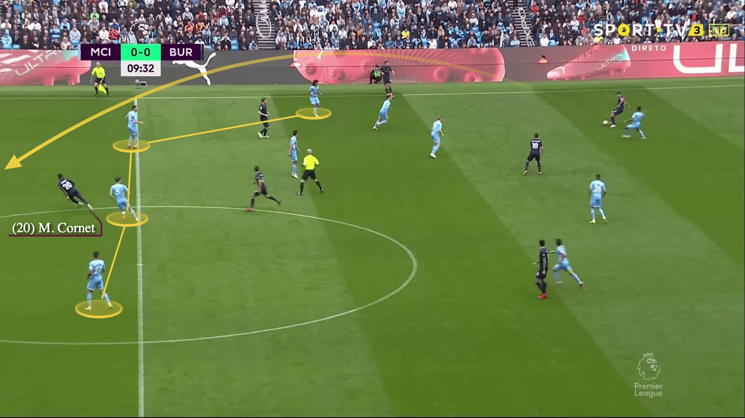 В приведенном ниже ролике после октябрьской домашней победы над «Бернли» со счетом 2:0 Натан Аке вышел вперед слева, в то время как три других защитника «Сити» удерживают свою линию и ловят Максвела Корнета в положении вне игры.