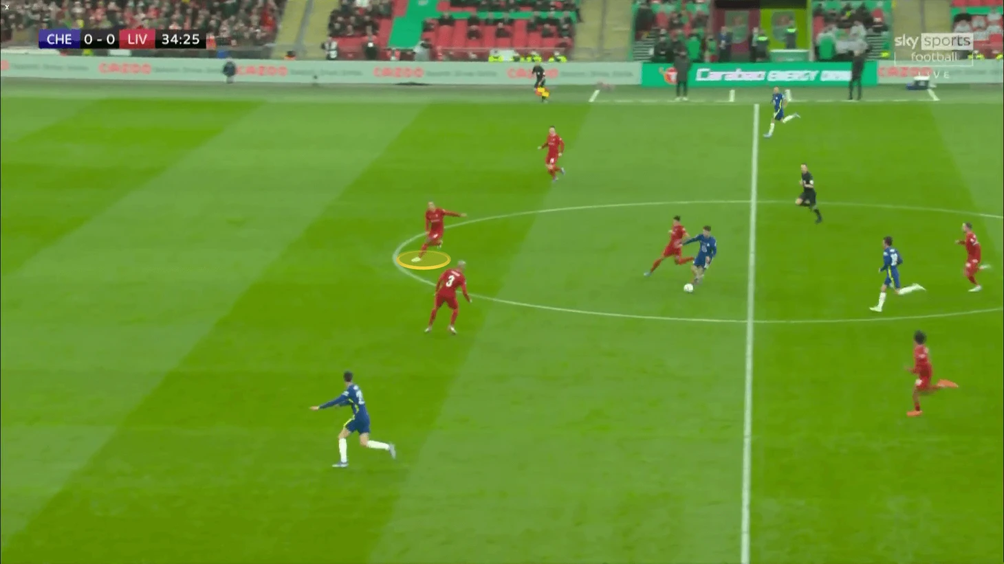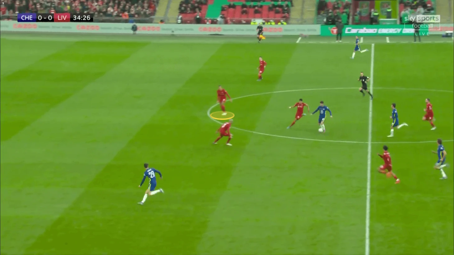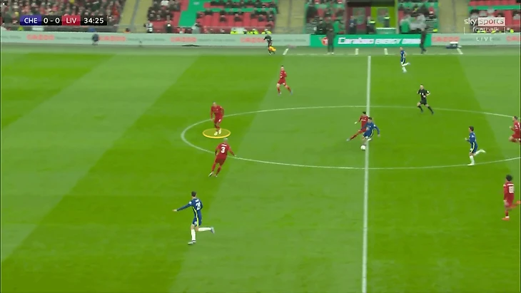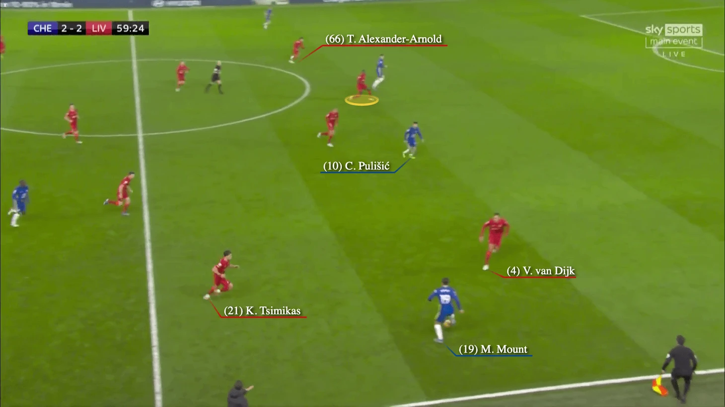 Ниже приведено изображение с другой ничьей со счетом 2:2, на этот раз на выезде против «Челси» в Премьер-лиге в январе. Ван Дейку пришлось иметь дело с Мейсоном Маунтом, потому что левый защитник Костас Цимикас убежал в атаку.