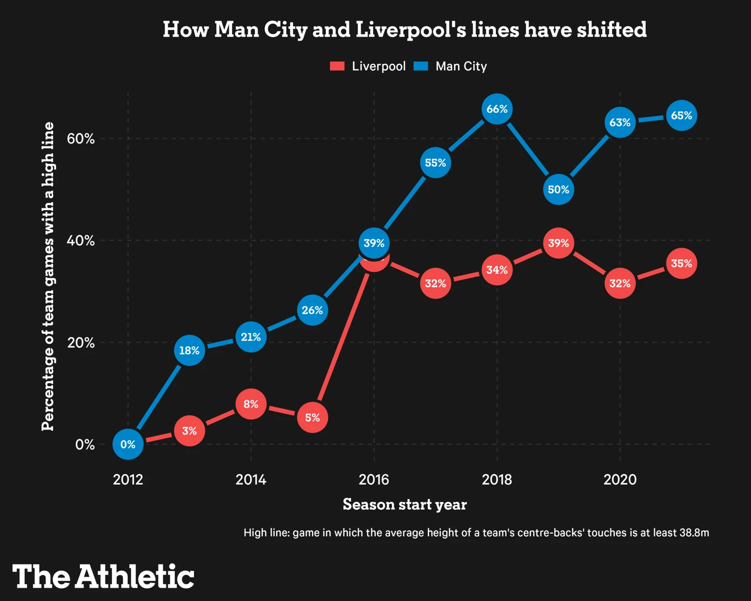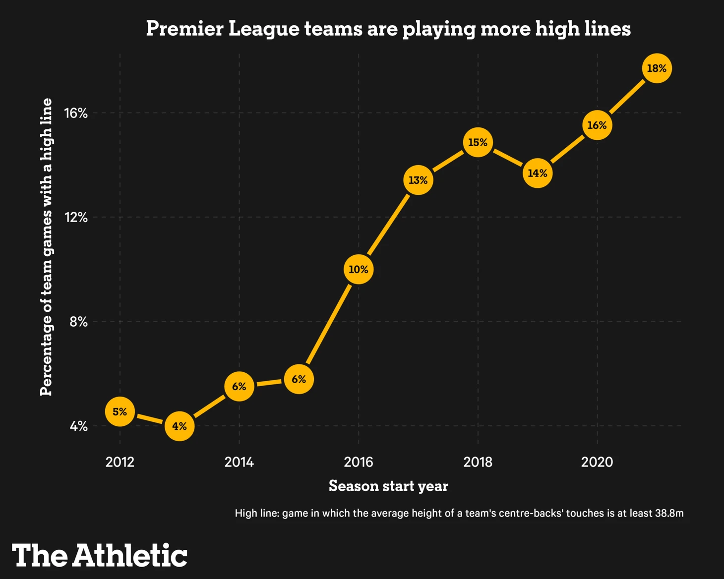 Используя это определение, за последнее десятилетие наблюдается явный рост числа команд Премьер-лиги, играющих с высокой линией, что отражает тактические изменения, которые мы наблюдали в игре — в частности, акцент на прессинге и контрпрессинге, и как это приводит к тому, что защитники находятся дальше от своих ворот.