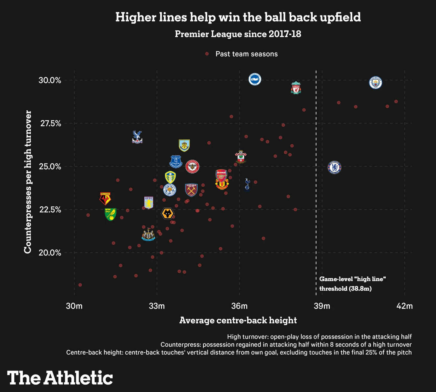 Горизонтальная ось X показывает среднюю высоту центрального защитника на поле при касании мяча (пунктирная линия представляет порог 38,8 м для высокой линии), а вертикальная ось Y показывает процент случаев, когда владение мячом было восстановлено на атакующей половине поля в течение восьми секунд после возврата мяча высоко в поле. «Сити», «Ливерпуль» и «Брайтон» — все они занимают видное место.