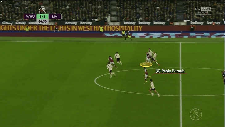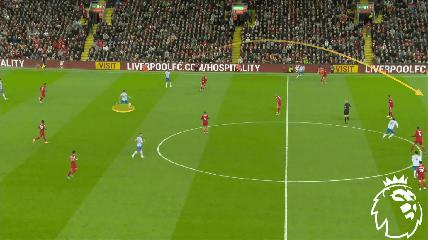 Это разумная игра со стороны Боуэна, подчеркивающая ценность бега с мячом и отдачи игроков, когда те противостоят высокой линии, и вынуждающая Ван Дейка и Матипа отступать, что противоречит их инстинктам. Из-за того, что к Боуэну привлечены три игрока «Ливерпуля», Пабло Форнальс, чуть левее своего владеющего мячом партнера по команде, остался почти незамеченным.