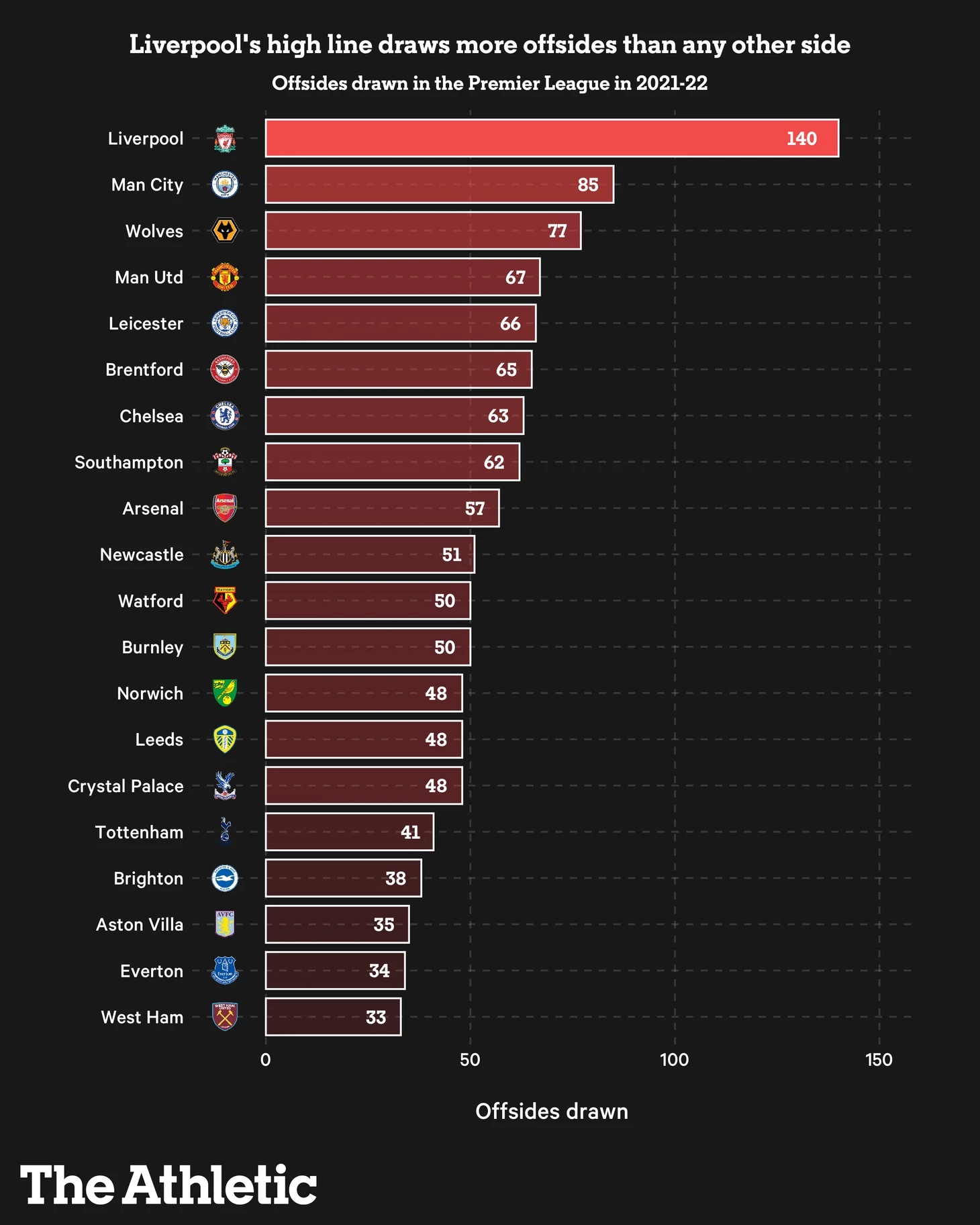 Если рассматривать эти 140 офсайдов в Премьер-лиге в контексте, то это на 55 больше, чем у «Манчестер Сити», следующего в этом же списке, и более чем вдвое больше, чем у всех остальных, кроме «Вулверхэмптон Уондерерс».